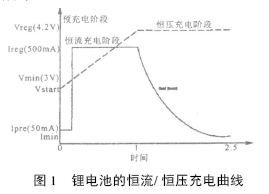 (2) 恒流充電階段. 在充電初期, 充電電路以恒定的電流對鋰離子電池充電, 一般鋰電池大多選用標準充電速率. 恒流充電時, 電池電壓將緩慢上升, 一旦電池電壓達到所設定的終止電壓, 恒流充電終止, 進入恒壓充電過程.