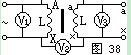 把初級線圈和次級線圈的一對同名端,例如Aa,用導線接起來,如圖38所示。然后在AX初級線圈間拉入交流電(比較低的便于測量的)。用電壓表分別測 量AX間電壓V1值,XX間電壓V2值,以及ax間電壓V3值。如果V2數值是V1與V3電壓之差,則Aa是同極性端,如果V2數值是V1與V3電壓之和,則AX是同極性端。