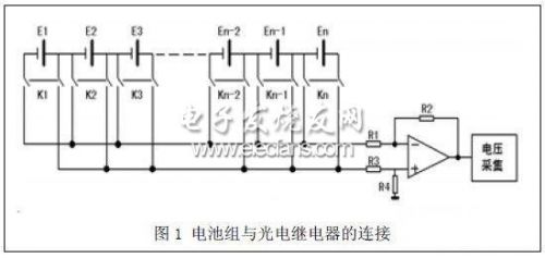 本文作者曾經基于光電繼電器隔離法設計了一套電池管理系統,單體電池電壓的測量是采用分時測量的方法。串聯電池組中各個電池的兩端通過光電繼電器隔離,然后統一連接到檢測總線上。按照一定的時間策略控制光電繼電器的通斷,可控制單體電池在不同的時間段單獨將電壓施加在檢測總線上,從而實現單體電池電壓的分時檢測。該方法的巡檢周期短,測量精度高。但是控制光電繼電器的通斷需要占用大量的I/O 資源,這就限制了電池管理系統可管理電池的數量。同時在電池管理系統的實際安裝時,由于電池兩端需要引線到采集模塊,所以就會有比較多的走線,導致電池管理系統安裝的不方便及電動車電氣走線的復雜性。本文為了改善以上的不足,提出一種新的光電繼電器控制策略。光電繼電器與串聯電池組的連接方式如圖1 所示。