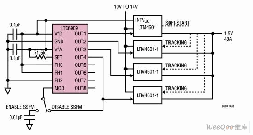 圖1:采用擴頻調制,可提供1至8個輸出的多相硅振蕩器LTC6909。