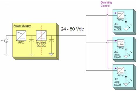 LED區(qū)域照明電源需要很多顆1 W LED來產(chǎn)生所要求的流明輸出(40到超過100顆),要可以調(diào)節(jié)設(shè)計(jì)以用于多種不同的光等級(jí),此外,街燈要求特殊的光分布,對(duì)光電器件有要求。大功率LED區(qū)域照明應(yīng)用中,一種常見的電源架構(gòu)是“功率因數(shù)校正(PFC)+恒壓(CV)+恒流(CC)”的三段式架構(gòu)。這種架構(gòu)中,交流輸入電源經(jīng)過功率因數(shù)校正和隔離型直流-直流(DC-DC)轉(zhuǎn)換后,輸出24至80 Vdc的固定電壓,提供給后面內(nèi)置DC-DC降壓轉(zhuǎn)換電路的恒流LED模塊(見圖2)。這種架構(gòu)的設(shè)計(jì)提供了能夠現(xiàn)場(chǎng)升級(jí)的模塊化途徑,可根據(jù)實(shí)際需求,靈活改變LED光條數(shù)量,從而增加或減小光輸出,滿足具體區(qū)域照明應(yīng)用要求。