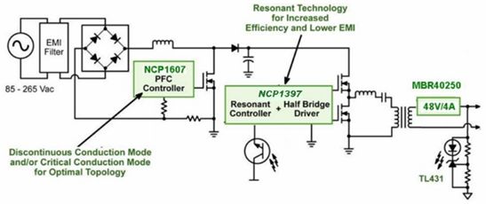 LLC拓?fù)浣Y(jié)構(gòu)采用串聯(lián)類型的諧振轉(zhuǎn)換器,能在相對(duì)寬的輸入電壓和輸出負(fù)載范圍下工作。此外,由于諧振儲(chǔ)能元件可以部分或完全集成在主變壓器中,LLC拓?fù)浣Y(jié)構(gòu)只需要數(shù)量有限的元器件。再加上在所有負(fù)載條件下,LLC拓?fù)浣Y(jié)構(gòu)的初級(jí)開關(guān)都能工作在零電壓開關(guān)條件,次級(jí)整流器都能工作在零電流開關(guān)條件。所以,LLC拓?fù)浣Y(jié)構(gòu)是高性價(jià)比、高能效及優(yōu)化了電磁干擾的解決方案。