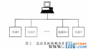 主從總線1∶N通信方式可以采用多種通信協(xié)議實(shí)現(xiàn)總線使用權(quán)的分配,本系統(tǒng)中使用的地址查詢方式,主從總線1∶N通信方式的監(jiān)控系統(tǒng)結(jié)構(gòu)示意圖如圖2所示。系統(tǒng)給每個(gè)電源分配唯一的一個(gè)地址號(hào),計(jì)算機(jī)分配一個(gè)固定的地址號(hào)。當(dāng)計(jì)算機(jī)需要和某臺(tái)電源建立通信時(shí),計(jì)算機(jī)發(fā)出一個(gè)含有該電源地址號(hào)的請(qǐng)求命令包。掛在總線上的所有電源一直處于等待接收數(shù)據(jù)狀態(tài),計(jì)算機(jī)所發(fā)出的請(qǐng)求命令包將被所有的電源所接收。每個(gè)電源將接收到的請(qǐng)求命令包中所包含的電源地址號(hào)與本模塊的地址號(hào)相比較,只有地址號(hào)與計(jì)算機(jī)所發(fā)出的請(qǐng)求命令包中所包含的地址號(hào)相同的電源才與計(jì)算機(jī)建立通信,響應(yīng)計(jì)算機(jī)所發(fā)出的請(qǐng)求命令。其它地址號(hào)不相同的電源將拒絕響應(yīng)計(jì)算機(jī)的請(qǐng)求命令,繼續(xù)保持接收數(shù)據(jù)狀態(tài),等待響應(yīng)計(jì)算機(jī)發(fā)出的下一個(gè)請(qǐng)求命令包。系統(tǒng)中的這種地址查詢方式實(shí)現(xiàn)了任何時(shí)候總線上最多只有一臺(tái)電源與計(jì)算機(jī)通信,其它電源處于等待接收數(shù)據(jù)狀態(tài),從而有效地避免了總線使用權(quán)的沖突。