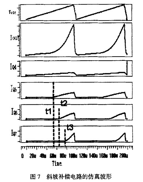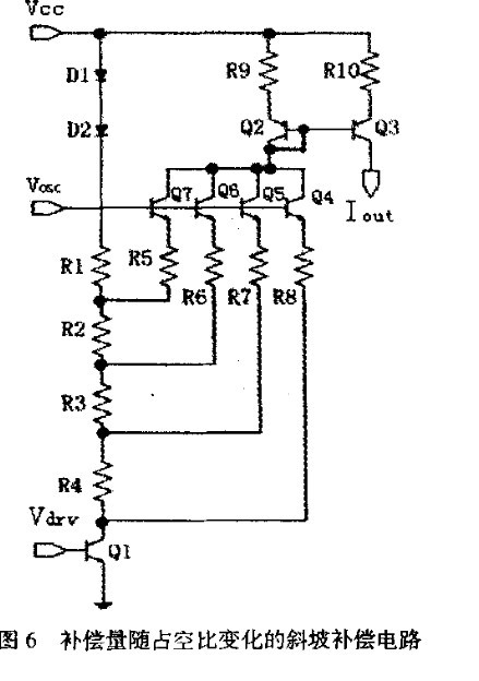 因?yàn)?Q4 ,Q5,Q 6和Q7是先后開(kāi)啟的,所以補(bǔ)償電流在時(shí)間軸上的斜率dlout/dt將隨著Vosc的增大而增大,即斜坡補(bǔ)償?shù)牧侩S占空比增大而增大。