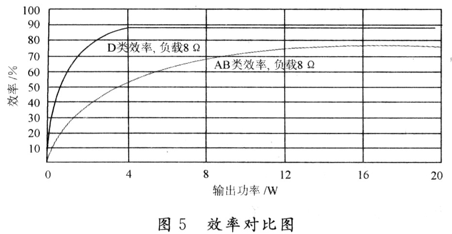由上述公式得知,D類功放中負載RL,相對其他電阻,比值越大效率越高;MOSFET作為續流開關,所消耗的功率幾乎等于MOSFET導通阻抗上I2RON損耗和靜態電流總和,相比較輸出到負載的功率幾乎可忽略。所以,其效率遠高于線性功放,如圖5所示。非常適應現今綠色節能的要求,適合被平板等數字視聽產品規模使用。