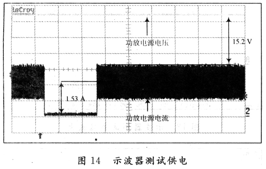 圖14測試了在圖10狀態下功放TFA9810T的供電電壓、電流實際波形。