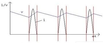 一般開關電源為容式濾波,在輸入與整流濾波部分電磁噪聲主要是由整流過程中造成的電流尖峰、電壓波動所引起的。正弦波電源經過電源濾波器進行差模、共模信號衰減后,由整流橋整流、電解電容濾波,得到的電壓作為高頻逆變部分的輸入電壓。由于濾波電容的存在,使整流器不象純整流那樣一組開通半個周期,而是只在正弦電壓高于電容電壓時才導通,造成電流波形非常陡峭,同時電壓波形變得平緩。電流、電壓的波形如圖2所示。