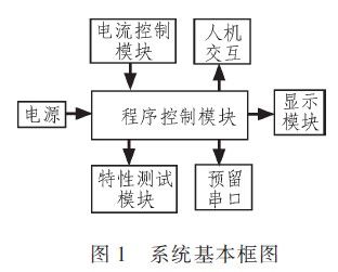 系統主要可以劃分為程序控制模塊、電流控制模塊、特性測試模塊和顯示模塊等4大部分,系統基本框圖如圖1所示。