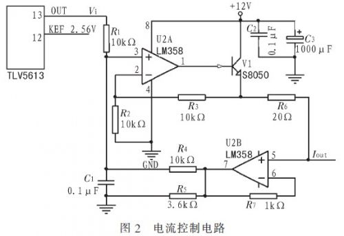 電流控制模塊:為了獲得較高的控制精度,選用12位精度的DAC(Digital-to-AnedIogueConverters,數模轉換器)TLV5613加上V/I轉換電路輸出穩定電流值加載到測量回路,用于控制二極管的工作電流。