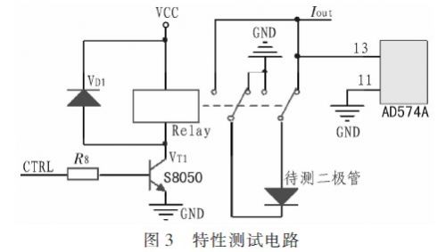 特性測試電路如圖3所示,圖中左側為繼電器控制電路,當CTRL端為高電平時,三極管VT1導通,VCC通過VT1加載到繼電器5引腳,繼電器動作,被測二極管接入極性轉換,二極管極性匹配后,即可進行特性測試。