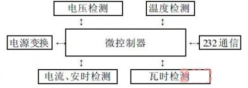 數(shù)據(jù)采集系統(tǒng)硬件結(jié)構(gòu)如圖2所示, 主要包括以下幾個(gè)模塊:微控制器、電源模塊、電流及安時(shí)檢測(cè)模塊、瓦時(shí)檢測(cè)模塊、電壓檢測(cè)模塊以及通信接口電路。