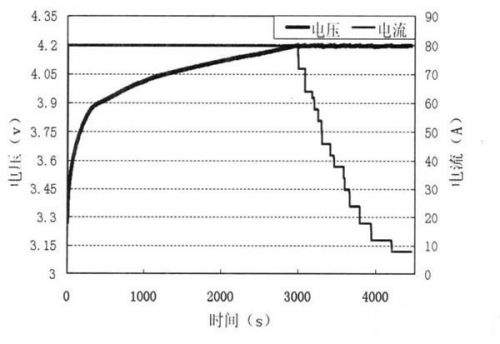 為了測(cè)試該系統(tǒng), 使用3. 7V /80Ah的錳酸鋰電池做恒流恒壓充電試驗(yàn)。在上位機(jī)程序中設(shè)置如下參數(shù): 恒流階段充電電流80A, 充電截止電壓4. 2V,恒壓階段截止電流0. 1A, 得到的充電曲線如圖4所示。
