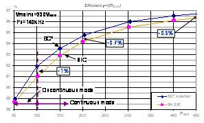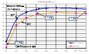 在90 VRMS電壓時,軟開關法的優點加上COSS 放電節省的電能好處進一步加強了BC²電路的優點。在450W輸出功率時,BC²比碳化硅二極管省電5.4 W,在低負載下,因為無關斷損耗,BC²比碳化硅二極管省電1.7%。