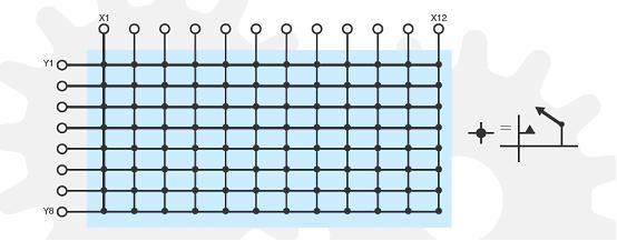 圖中是一個12*8的矩陣開關。這個矩陣開關是由96個繼電器將8條Y向線路和12條X向線路連接在一起的。在每個交叉點上都有一個繼電器,這個繼電器是將橫向X軸和縱向Y軸連接在一起,或將兩者分開的。