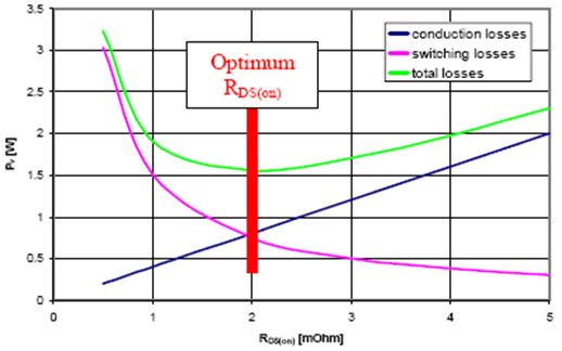 當RDS(on)在1毫歐姆至3毫歐姆范圍內時,總功耗始終大致相同。但是,在1毫歐姆以下,RDS(on)僅下降0.5毫歐姆,便會令總功耗提高一倍,從而嚴重降低電源轉換器的效率。