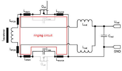 并且,環路的寄生電阻會抑制振蕩(Coss = MOSFET的輸出電容, Lstray = Lsource + Ldrain + LPCB + Ltransformer)。僅當二次側的環路電感限制了電流換向時,此處討論的波形形狀才有效。這就意味著,限制di/dt的不是一次側MOSFET的開啟速度,而是電源的二次側的雜散電感。