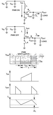 注意,開關調節器既可以連續工作,也可以斷續工作以連續導通模式 (CCM), 工作時,電感電流不會降至0;以斷續導通模式 (DCM),工作時,電感電流可以降至0. 電流紋波,在圖2中顯示為ΔIL 使用公式ΔIL = (VIN × tON)/L.計算。平均電感電流流入負載,而紋波電流流入輸出電容。