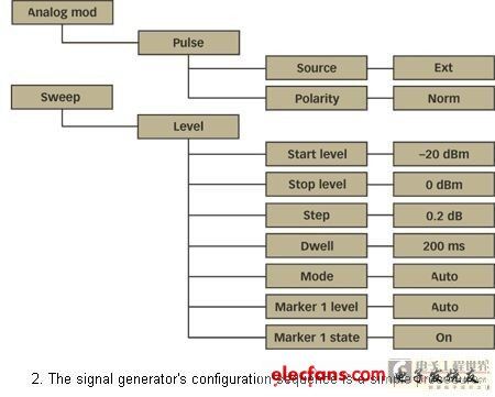 測試臺(圖1)使用一個與SMIQ RF信號發(fā)生器“脈沖”輸入相連接的脈沖發(fā)生器。為了在功率掃描模式中使用SMIQ,功率掃描必須與信號分析器中的時基掃描同步。幸好,當與二極管檢測器和類似XY模式濾波鏡的顯示器相關(guān)聯(lián)時,這一類信號發(fā)生器具有可以被用作純量網(wǎng)絡(luò)分析儀(SNA)的特性。在SMIQ的后部面板上,有幾個帶有功率掃描斜線以驅(qū)動濾波鏡的X軸的BNC連接器,以及校準顯示器X軸的標記。既然這樣,“標記”的輸出被當作信號分析器的觸發(fā)信號來使用。