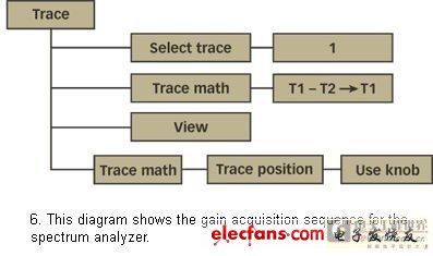 用于頻譜分析器的功能序列顯示在圖6中。線跡1設(shè)定為計算“線跡1”減去“線跡2”,后者包含了輸入功率。這樣,新獲取的輸出功率將提供一個以dB為單位的增益圖。“線跡位置”特征被用作獲得直接讀取以dB為單位的絕對增益的一個偏差。線跡偏差被設(shè)置為“輸出偏差”減去“輸入偏差”。這種情況下,“輸入偏差”在校準階段被確定為30.7dB,結(jié)果得到偏差值為13dB。該值不能直接作為以dBm為單位的偏差值加入,因為“線跡位置”清單只接受作為Y刻度百分比的輸入。旋轉(zhuǎn)鈕用來獲取與13dB偏差值相對應(yīng)的正確百分比。圖7中的藍線即為所得。