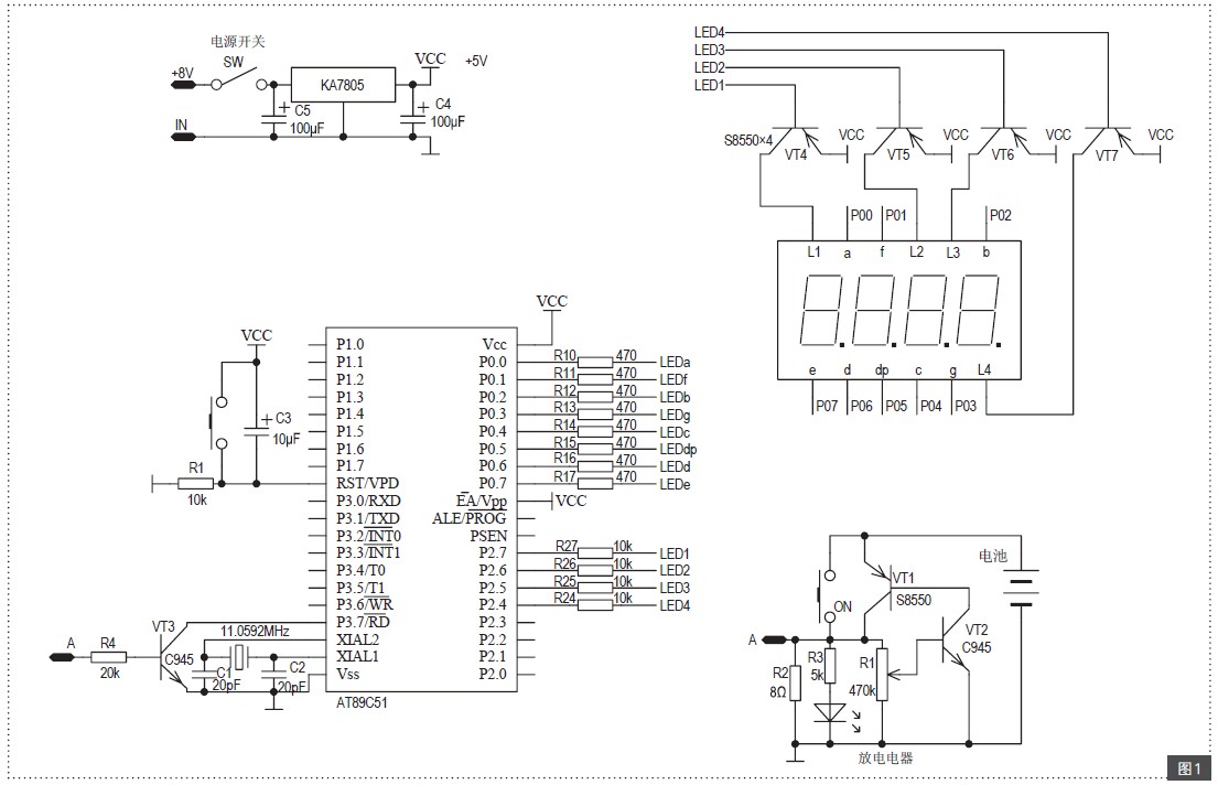 各種電池兩小時率電流放電能夠維持的放電時間一般都是在1.5小時以下的。這里單片機計時系統使用秒計時,4位LED數碼管顯示。最大計時時間9999秒,大約2.7小時。
