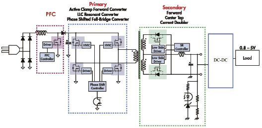 這里我們首先以AC-DC同步整流應(yīng)用為例。在通訊電源的應(yīng)用中它的主功率部分主要由功率校正電路、原邊的電源轉(zhuǎn)換電路、副邊的整流電路組成,我們可以很清楚的看到,在圖中有非常多的功率器件,系統(tǒng)的效率也就由這些功率器件的工作效率以及本身的性能優(yōu)劣決定。