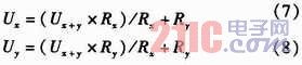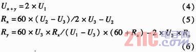 如圖2所示,U+和U-為被測線路的母線供電電壓,正常工作時(shí)兩母線間的電壓差Ux+y為440 V,且隨蓄電池內(nèi)阻變化。Rx,Ry分別為被測線路的正母線絕緣電阻和負(fù)母線絕緣電阻。正、負(fù)母線絕緣電阻反映的是64路的正、負(fù)支路的總體絕緣性能,等效于各個(gè)支路的正、負(fù)絕緣電阻的并聯(lián),正常時(shí)兩母線絕緣電阻>20 kΩ。Ux和Uy為正負(fù)母線對地電壓,大小隨正負(fù)母線的絕緣電阻變化,但兩母線電壓差恒定為Ux+y。為了檢測正負(fù)母線電壓Ux,Uy,Rx,Ry,系統(tǒng)采用了“平衡-不平衡檢測法”檢測母線電壓和母線絕緣電阻。計(jì)算公式如式(1)所示。