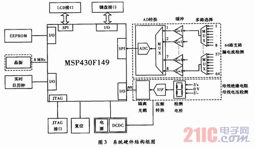 直流接地檢測系統(tǒng)采用低功耗處理器MSP430F149為硬件核心,外圍電路可分為數(shù)據(jù)采集模塊、人機(jī)交互模塊、處理器模塊。數(shù)據(jù)采集模塊負(fù)責(zé)檢測64路支路的漏電流、母線電壓、母線絕緣電阻;人機(jī)交互模塊負(fù)責(zé)進(jìn)行液晶顯示和鍵盤輸入;處理器模塊負(fù)責(zé)協(xié)調(diào)整個(gè)系統(tǒng)的數(shù)據(jù)處理,數(shù)據(jù)存儲(chǔ),人機(jī)交互等。具體的硬件結(jié)構(gòu)框圖,如圖3所示。
