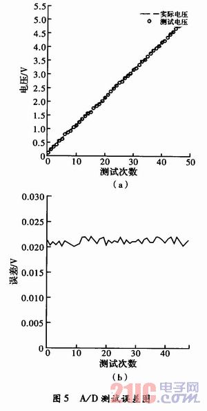 為了達(dá)到好的測試效果,A/D采集必須達(dá)到一定的測試精度,圖5是A/D采集的實(shí)測數(shù)據(jù)和測試誤差分析曲線,從圖中可以看出,A/D采集的誤差約20 mV,屬于正常范圍,因?yàn)橄到y(tǒng)采用8位A/D,5 V基準(zhǔn)電壓。這個(gè)采樣精度滿足整體的設(shè)計(jì)要求。