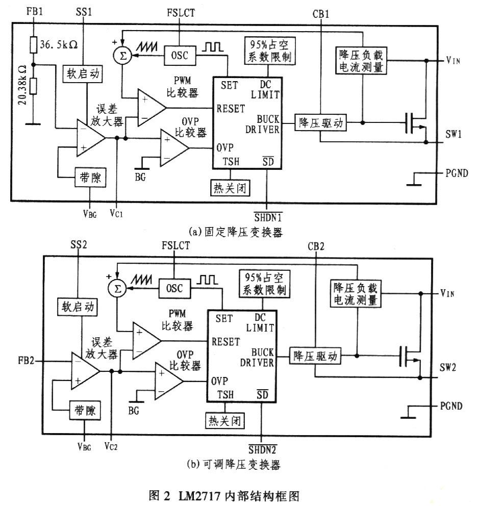 LM2717是美國(guó)國(guó)家半導(dǎo)體公司推出的一款全新的高性能DC/DC變換器,內(nèi)含2個(gè)降壓脈寬調(diào)制(PWM)直流/直流變換器,其中一個(gè)專(zhuān)門(mén)用來(lái)提供固定輸出3.3 V電壓,另一個(gè)專(zhuān)門(mén)用來(lái)提供可調(diào)輸出電壓。2個(gè)變換器都設(shè)有導(dǎo)通電阻(RDSON)只有0.16 Ω的內(nèi)部開(kāi)關(guān),確保轉(zhuǎn)換效率最高,工作頻率可以在300 kHz~600 kHz調(diào)節(jié),系統(tǒng)可以采用較小巧的外部元件。每個(gè)變換器也可以用其關(guān)閉引腳單獨(dú)關(guān)閉。該電路可廣泛應(yīng)用于薄膜晶體管液晶顯示器(TFT-LCD)、測(cè)控裝置、便攜式產(chǎn)品和膝上電腦。