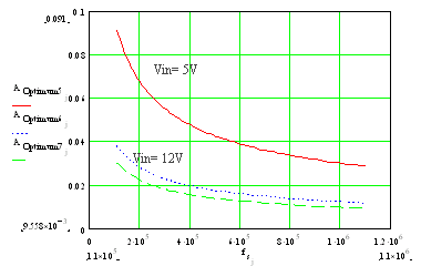 圖4:在同步整流器MOSFET不同開關頻率上的最優化裸片面積是負載電流的函數。