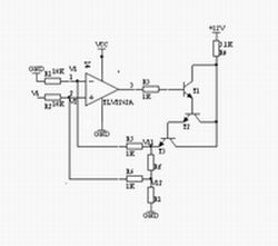 電壓-電流轉(zhuǎn)換模塊由精密運放與三個晶體管組成的達(dá)林頓管電路構(gòu)成。轉(zhuǎn)換電路利用晶體管平坦的輸出特性和深度負(fù)反饋電路使輸出電流穩(wěn)定,如圖2所示,此V/I轉(zhuǎn)換電路的帶負(fù)載能力強,電流輸出范圍達(dá)0~3A。輸出電流Io經(jīng)反饋電阻Rf得到一個反饋電壓Vf,Vf= V11-V12,通過R5、R6加到運算放大器的兩輸入端,設(shè)運放兩端的電為V1、V2,Vi由單片機(jī)DAC輸出。因為理想運放的輸入電流約等于零,且 V1=V2,則: