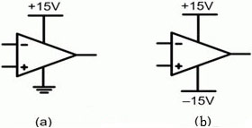 給一個運算放大器供電有兩種常見方法。第一種也是最簡單的一種方法是使用一個單一正電源,如圖1(a)所示。第二種方法是使用一個分離(雙)電源(如圖1(b)所示),其同時具有一個正電壓和一個負(fù)電壓。這種分離電源在許多模擬電路中都非常有用,因為它允許包括零電壓電位的輸入信號或者在正與負(fù)之間搖擺的輸入信號。