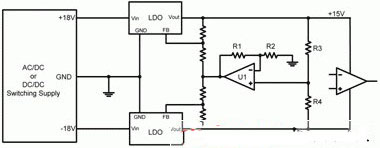 圖2顯示了一個典型運算放大器電源電路的示意圖。此處,一個開關(guān)電源提供一個正18V和一個負(fù)18V。兩低壓降(LDO)線性穩(wěn)壓器進(jìn)一步將±18V調(diào)節(jié)至±15V。該LDO一般安裝在電源和運算放大器之間,旨在降低開關(guān)電源產(chǎn)生的高頻開關(guān)噪聲。LDO具有較高的電源抑制(以比率表示,PSRR),其減弱了寬帶頻率下LDO輸入的噪聲。