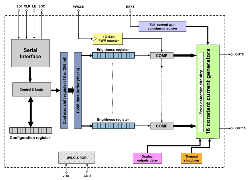 這款產(chǎn)品是一個(gè)16通道LED驅(qū)動(dòng)器,內(nèi)置一個(gè)高頻串行數(shù)據(jù)接口。每路通道的最大輸出電流為60mA,可以通過一個(gè)外部電阻器調(diào)節(jié)輸出電流,使用一個(gè)8位增益寄存器可以精確調(diào)節(jié)256級(jí)灰度。