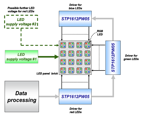 圖 3:通過STP1612PW05驅(qū)動(dòng)一個(gè)全彩LED顯示屏點(diǎn)陣的設(shè)計(jì)簡(jiǎn)圖