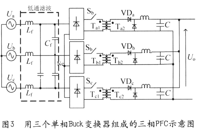 圖3用三個(gè)單相Buck變換器組成的三相PFC示意圖,圖3所示Buck型電路的結(jié)構(gòu)比較簡(jiǎn)單,同全橋電路相似,由于隔離變壓器反射電壓的影響,其相對(duì)于反激電路來(lái)說(shuō)也有較大的電流失真,但其諧波仍可以限定在比較低水平,達(dá)到IEC—1000的要求。另外,其可實(shí)現(xiàn)的功率等級(jí)的大小不如全橋高,但比反激式電路要大。