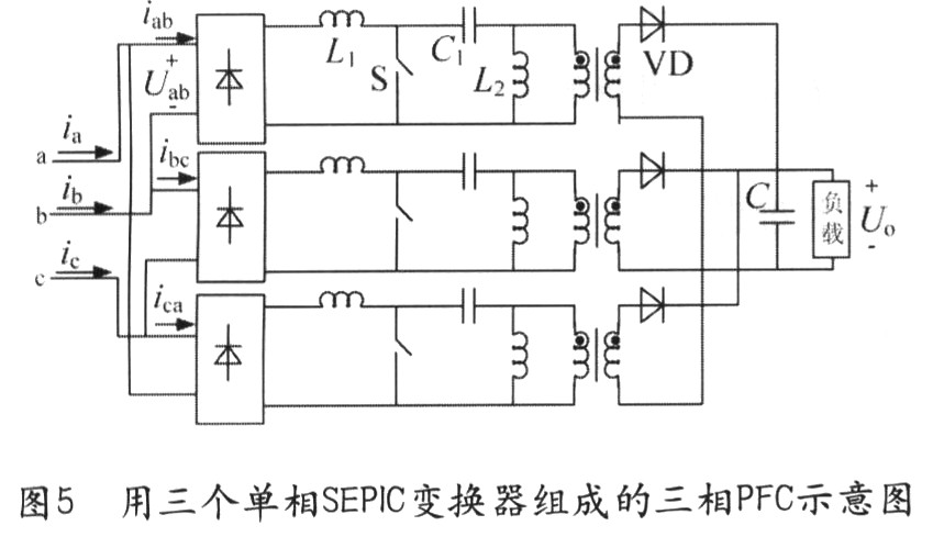 在Boost變換中,傳統(tǒng)的隔離在此種情況下的應(yīng)用并不理想,因?yàn)樵陔娏鬟B續(xù)情況下,器件將產(chǎn)生高的電壓應(yīng)力,在電流斷續(xù)情況下將產(chǎn)生較大的輸入電流失真。圖5所示的電路是用隔離SEPIC電路組成的三相PFC電路,SEPIC變換器的輸入端類似于Boost電路,因此具有Boost電路的優(yōu)點(diǎn),如有低的輸入電流失真和更小的EMI濾波器。在輸出端SEPIC電路像反激式變換器,從而不必以增加電壓為代價(jià)達(dá)到隔離的作用。