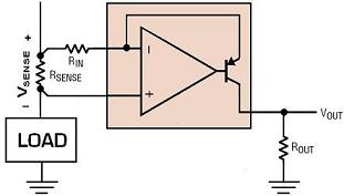 為了克服這些電流檢測難題,人們創(chuàng)造了高端電流檢測放大器。這些特殊放大器用來從高共模電壓中抽取通過小檢測電阻的電流產(chǎn)生的小差分電壓。然后,檢測電壓被放大并被轉(zhuǎn)換成以地為基準的信號。圖 5 顯示了高端電流檢測放大器的基本拓撲。在這個圖中,放大器給 RIN 加上等于 VSENSE 的電壓。然后,通過 RIN 的電流流過 ROUT,提供以地為基準的輸出電壓。就這個基本功能而言,很明顯,高端電流檢測放大器應(yīng)該有高輸入阻抗、高增益和高增益準確度、以及寬共模范圍和良好的共模抑制。也許不那么明顯的是還有放大器精確度的重要性。