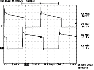 (b)圖中,示意了隔離變壓器副邊輸出的兩路驅(qū)動波形,可以直接驅(qū)動開關(guān)管。從圖中可以看出驅(qū)動波形比較理想:有快速的上升沿,并在一開始有一定的過沖,可以加速開通,減小了開通損耗;同時,有反偏截止電壓,提供了足夠的反相門極驅(qū)動,減小了下降時間;很好地驗(yàn)證了驅(qū)動電路的設(shè)計(jì)是合理的。