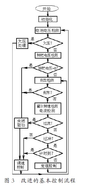 根據上述思路將軟件控制流程進行修改。如圖3 所示。將“速度增大而電流不增”作為“過沖”的判斷依據。控制器持續檢測速度變化和電流變化,再經過判斷,如果不屬于“過沖”的情況,則執行子程序“調速控制”。這種情況下控制器檢測轉把電壓值來調整PWM,增大或減小電流值使速度變化直至達到操作者通過轉把設定的速度值。