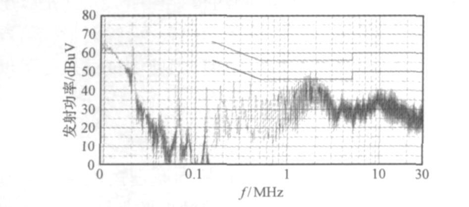 一鎳氫電池充電器產(chǎn)品, 額定功率5W.在其出廠前, 用實(shí)驗(yàn)室設(shè)備(人工電源網(wǎng)絡(luò)為PMM L2??16A,EM I接收機(jī)為PMM9010) 對(duì)其進(jìn)行預(yù)測(cè)試, 采用的測(cè)試標(biāo)準(zhǔn)為GB55014,,其結(jié)果如圖4所示。