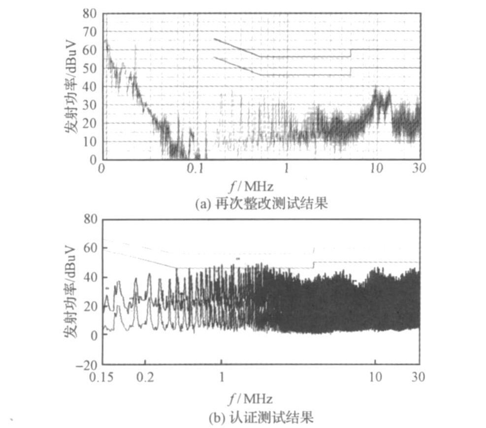 從圖6測(cè)試的結(jié)果分析可知, 在2MHz附近干擾信號(hào)幅值相對(duì)原先的最大降幅為5 dBuV, 但是在0. 8MHz~1MH z頻率領(lǐng)域干擾幅度有所增加, 峰值較為靠近標(biāo)準(zhǔn)限值。雖然預(yù)測(cè)試的結(jié)果已經(jīng)低于標(biāo)準(zhǔn)限值, 但是為了能一次性通過(guò)認(rèn)證就必須留出余量。再次改進(jìn)具體措施為: