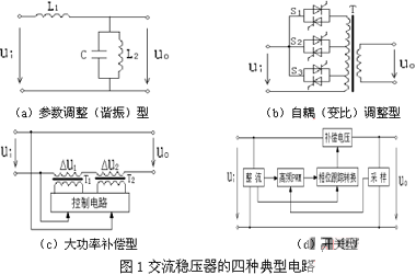 由于我國交流電網的電壓波動較大,特別是邊遠農村地區,交流穩壓電源已成為許多電子設備不可缺少的供電裝置[1]。按照工作原理,交流穩壓電源可分為參 數調整(諧振)型[2]、自耦(變比)調整型[3]、大功率補償型[4、5]和開關型[6、7]等四種類型,其典型電路如圖1所示?!?nbsp;