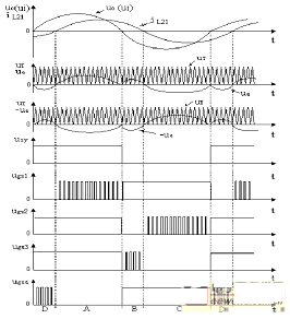 新穎的Buck-Boost型正弦交流穩壓器,采用具有輸入電壓極性和工作模式選擇的電壓瞬時值反饋控制方案,其感性負載時的原理波形如圖3所示。圖中 iL21為高頻儲能式變壓器的副邊電感電流iL2的基波分量。通過調節PWM信號的占空比,即可實現正弦交流穩壓器輸出電壓的穩定。輸出濾波電容與負載的 并聯阻抗等效為感性、容性、阻性時,正弦交流穩壓器的工作模式順序分別為A-B-C-D、D-C-B-A、A-C。