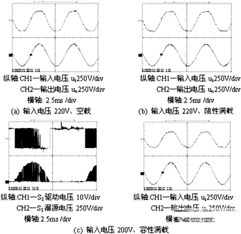 不同輸入電壓和負載時,500VA 220V±10%50Hz/220V50Hz Buck-Boost型正弦交流穩壓器的原理試驗波形,如圖4所示。原理試驗結果表明:Buck-Boost型正弦交流穩壓器工作時存在四種DCM模式 A、B、C、D;輸出電壓波形THD含量低;負載適應能力強;穩壓性能好。試驗結果與理論分析一致。