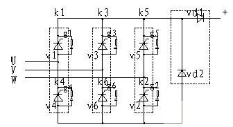 隨著現代集成技術的發展,功率大、體積小的可控硅模塊取代了原來的單元可控硅,一般一個橋臂是一個可控硅模塊,三個可控硅模塊組成一個三相全控橋,再加上一個有續流二極管和隔離二極管組成的二極管模塊,就組成了充電機的整流部分(見圖2),虛線框內表示為一個模塊。照下面的接線方式,可控硅的觸發順序為V1、V2、V3、V4、V5、V6。