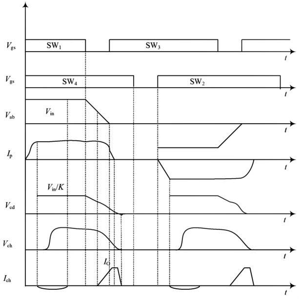 輔助電路在輸出濾波電感磁芯上加一個繞組,當原邊向副邊傳送能量時,由增加的繞組經輔助回路給箝位電容Ch充電。其后當S1關斷,原邊電壓過零期間,Ch經過二極管Dh放電,把電壓折射到原邊,通過箝位電容的放電,流經變壓器原邊的電流下降到0,為滯后橋臂提供零電流開關條件。SW1~SW4為IGBT的驅動信號。各開關管的時序和整個電路的工作狀態如圖5所示。