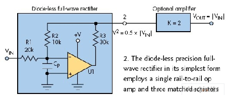 圖2:最簡(jiǎn)單的無(wú)二極管精精密全波整流器采用單個(gè)軌至軌運(yùn)算放大器和三個(gè)匹配的電阻。