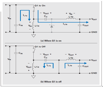 圖 1 顯示了 ZETA 轉換器的簡單電路圖,其由一個輸入電容 CIN、一個輸出電容 COUT、耦合電感 L1a 和 L1b、一個 AC 耦合電容 CC、一個功率 PMOS FET 即 Q1,以及一個二極管 D1 組成。圖 2 顯示了 Q1 為開啟狀態和 Q1 為關閉狀態時,在 CCM 下運行的轉換器。
