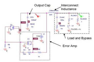 為了討論方便,圖1顯示了電源系統的P-SPICE模型。本圖由補償電路電源、調制器(G1)和輸出電容器組成。內部還包括互連電感、旁路電容負載模型、DC負載和步進負載。